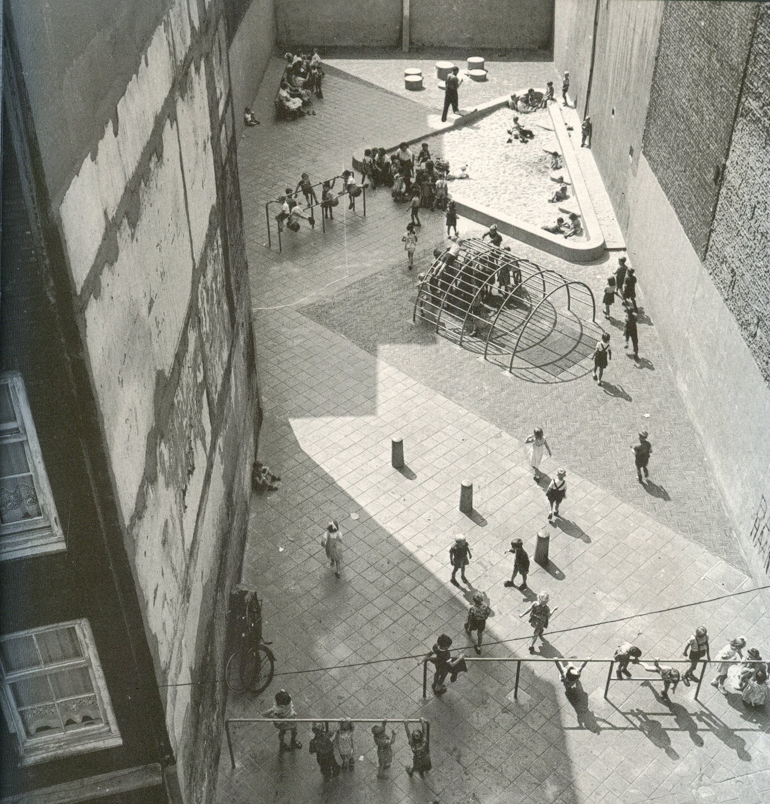 Recordemos que los 150.000 habitantes del distrito Centro siguen, aún, sin piscina tras demolerse el antiguo polideportivo y paralizarse las obras de construcción del nuevo (Rubio y Álvarez Sala). La fecha de comienzo de las obras estaba prevista en 2008. De esta idea arranca la propuesta de eXYZt, que el espacio destinado al ciudadano vuelva a ser del ciudadano. En esta línea de actuación parece inevitable acordarse de las intervenciones de Aldo van Eyck para la ciudad de Amsterdam (antes y después).