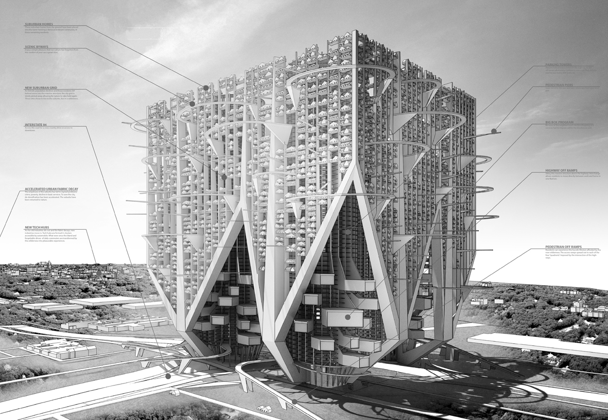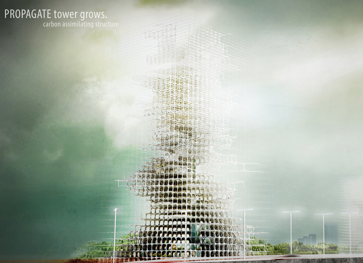 – “Propagate Skyscraper” de Yuhao Liu y Rui Wu de Canadá. Investiga el uso estructural de dióxido de carbono en los rascacielos. Dotado con 1000 $.