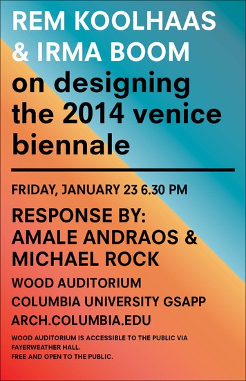 ArquitecturaBoom, Koolhaas, Andraos, Rock @ Columbia.Posted on 22/01/2015 by Edgar GonzalezReading time less than 1 minuteEsta noche a las 18.30 hora de NYC, Irma Boom y Rem Koolhaas nos explican la experiencia de diseñar la bienal de venecia.la respuesta a la conferencia por Amale Andraos y Michael Rock.no te la puedes perder.has compartido hoy? Comparte en Facebook (Se abre en una ventana nueva) Facebook Compartir en LinkedIn (Se abre en una ventana nueva) LinkedIn Compartir en WhatsApp (Se abre en una ventana nueva) WhatsApp Haz clic en Pinterest (Se abre en una ventana nueva) Pinterest Compartir en X (Se abre en una ventana nueva) X Me gusta esto:Me gusta Cargando...Puede que también te interese...