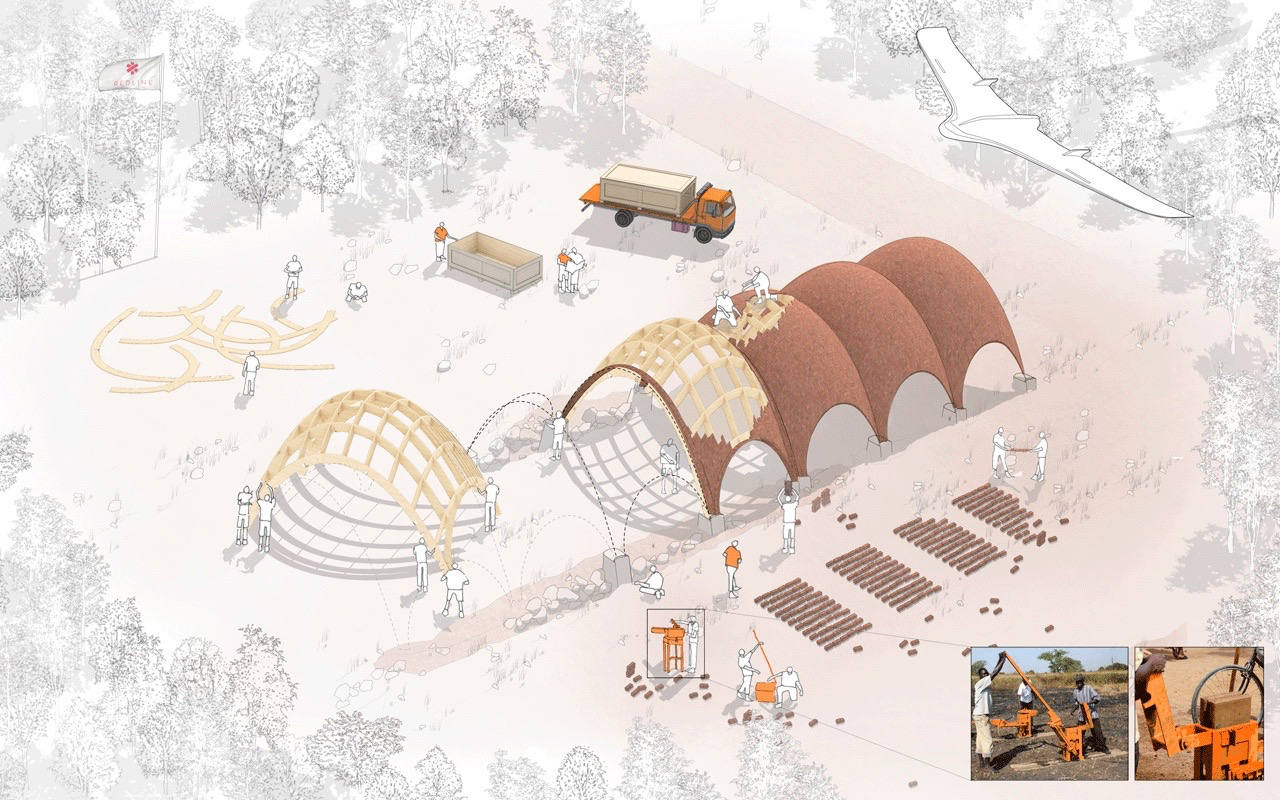 La experiencia del estudio construyendo aeropuertos, se ha puesto en práctica para proponer este sistema, del cual solo se provee con los elementos esenciales: las vigas y la prensa de ladrillos de barro, la construccion se lleva a cabo con tierra del lugar reduciendo así el transporte de material con el consecuente ahorro de costes y la sostenibilidad.