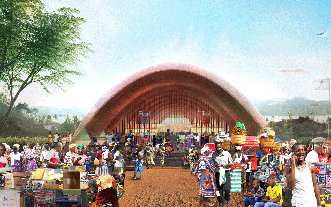 La icónica naturaleza del edificio permite convertirlo en una pieza central en el paisaje cívico de los poblados, en los que se prevé que se implique la comunidad en su construcción. El espacio ademas de servir como zona para aterrizaje de los drones, incluirá espacio para una clínica, un taller de fabricación digital, y un mercadillo para enseres comprados electrónicamente.