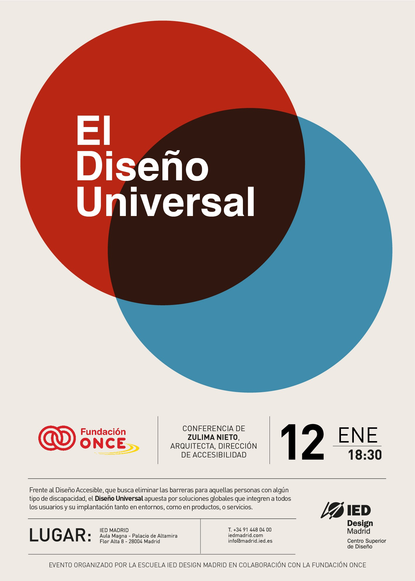 Desde el IED Design Madrid, queremos invitaros a una conferencia muy especial de la mano de la Fundación ONCE: «El Diseño Universal», lo que en España conocemos como «Diseño para todas las personas». Una conferencia realmente interesante que tendrá lugar el próximo martes 12 de enero en el Aula Magna del IED Madrid, a las 18,30h.