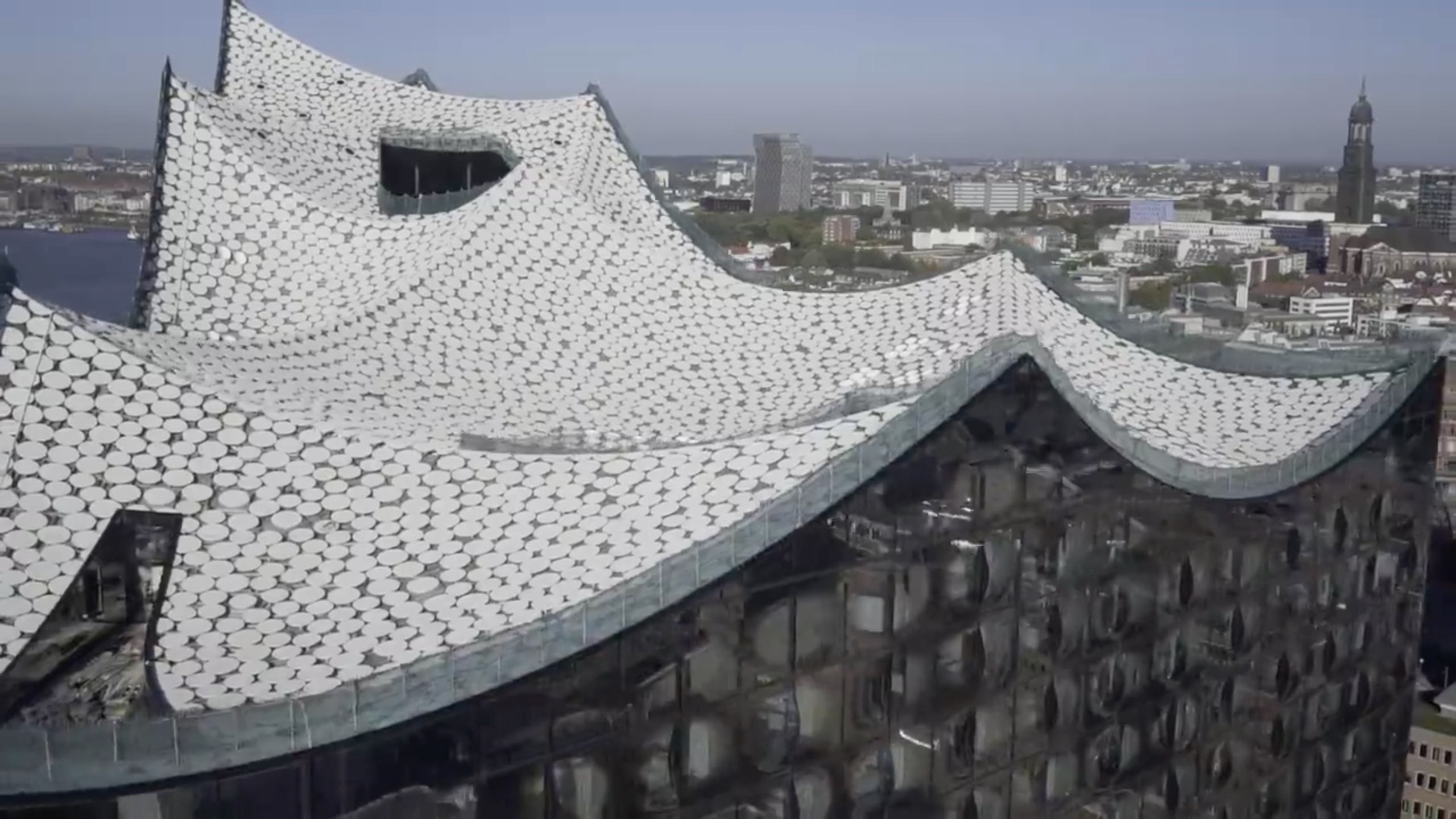 Un paseo con un video-drone por las cubiertas de la la filarmónica de Hamburgo de Herzog y de Meuron